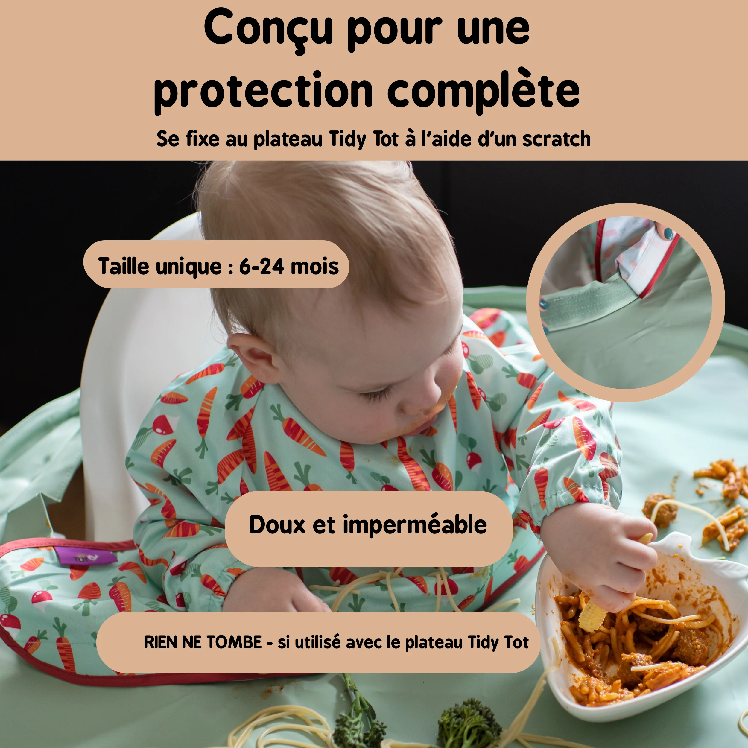 Le Bavoir Supplémentaire Tidy Tot protège les vêtements de bébé des salissures et éclaboussures des repas grâce à ses manches longues et son design de protection complète.