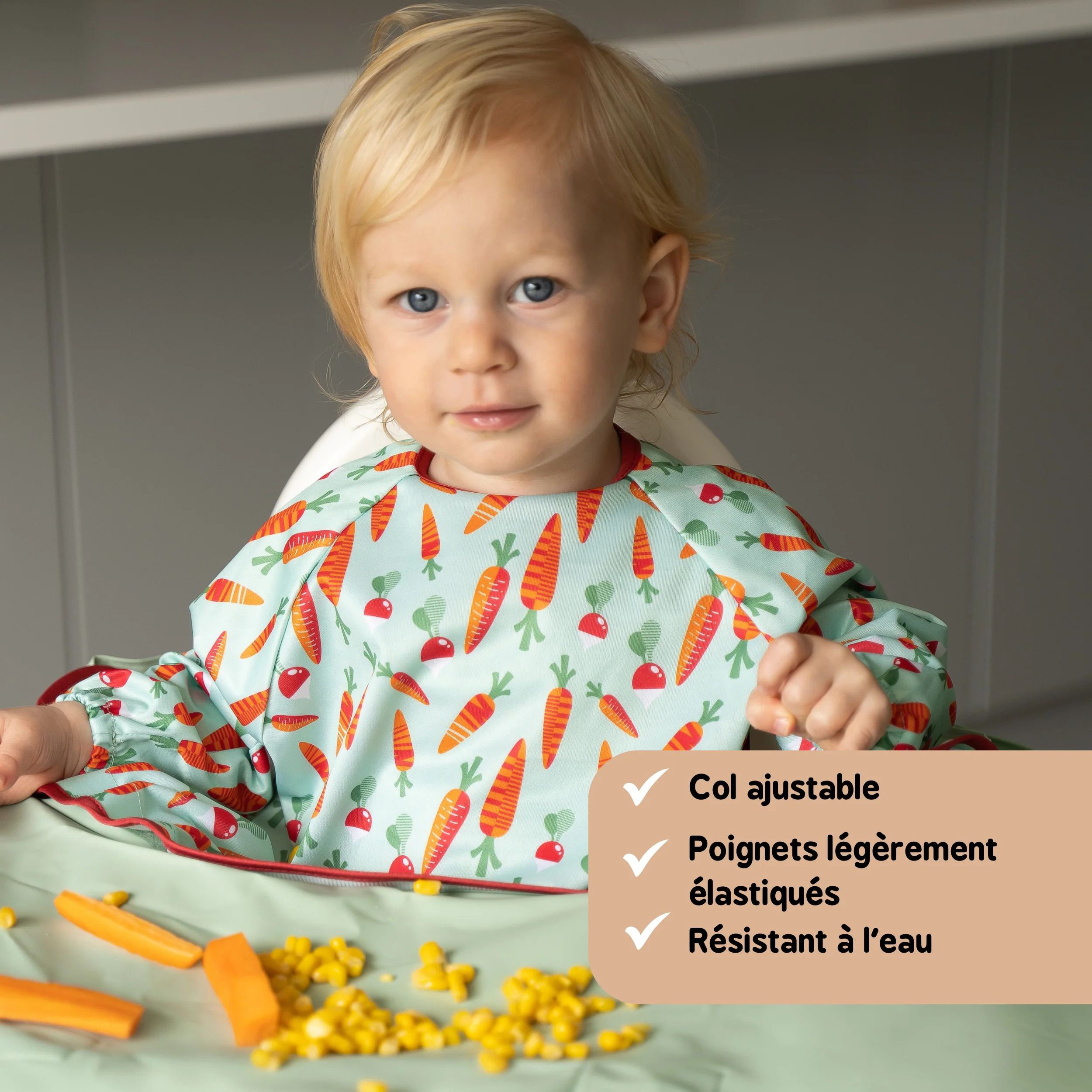 Protège efficacement les vêtements de bébé pendant les repas