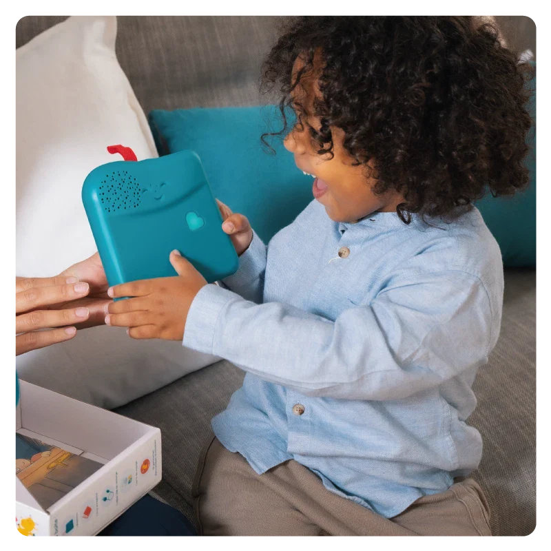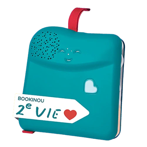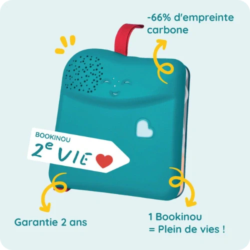 Depuis 2024, Bookinou existe aussi en version reconditionné : c’est notre Bookinou 2e vie, qui permet de réduire de 66% son impact écologique ! 🎙️ Grâce à lui, l’enfant peut écouter ses histoires préférées, livre en main, avec vos voix qui le guident. Il passe la gommette devant le lecteur, prend son livre, et suit l’histoire en autonomie, page après page.