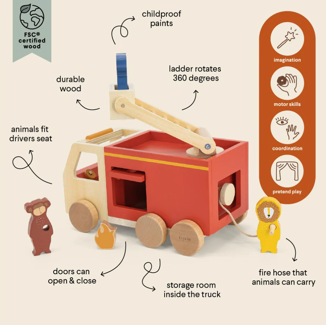 Les pompiers sont là ! Les petits animaux foncent vers toutes les urgences. Ils montent vite sur la grande échelle, lance à incendie en main, prêts à éteindre le feu en un éclair ! Ce camion est parfait pour des heures de jeu pleines d’aventures et d’imagination.