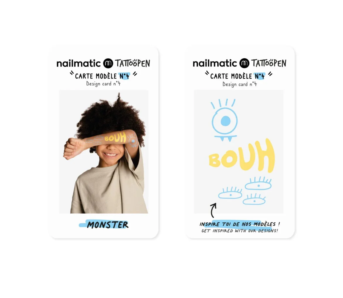 Un cadeau idéal pour encourager les jeunes artistes! Ce coffret Tattoopen Monster comprend deux feutres pour tatouages temporaires ainsi que des cartes remplies d’idées pour dessiner des monstres rigolos. Chaque carte offre un dessin au recto et son rendu sur la peau au verso, pour guider les enfants dans leur création. Avec un feutre bleu ciel, un jaune 4 cartes modèles et une notice, ils peuvent facilement reproduire ou inventer leurs propres tatouages. Un espace créatif parfait pour accompagner les petits et grands dans leur imagination.