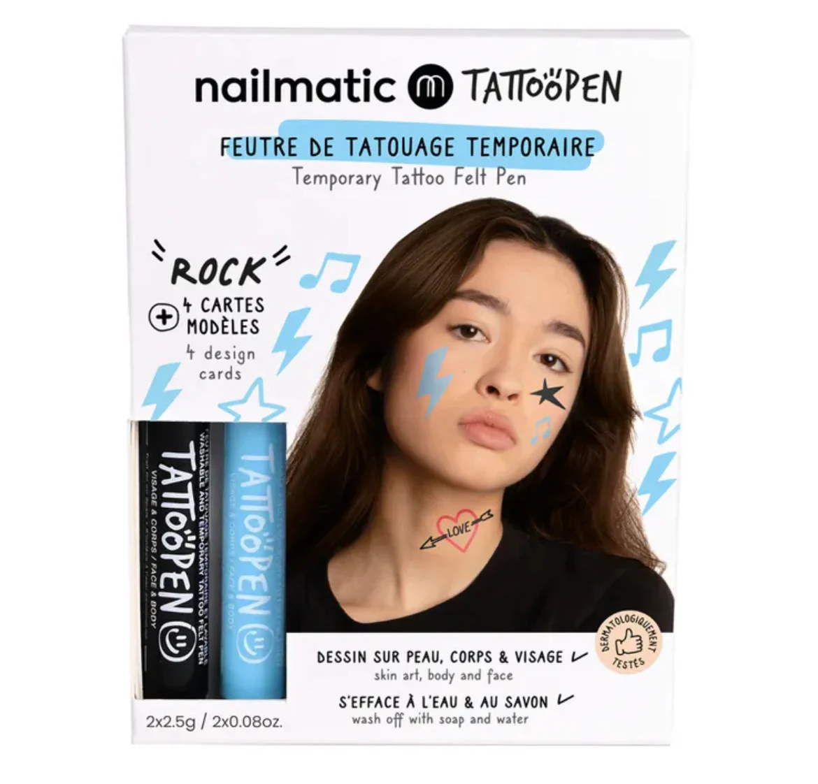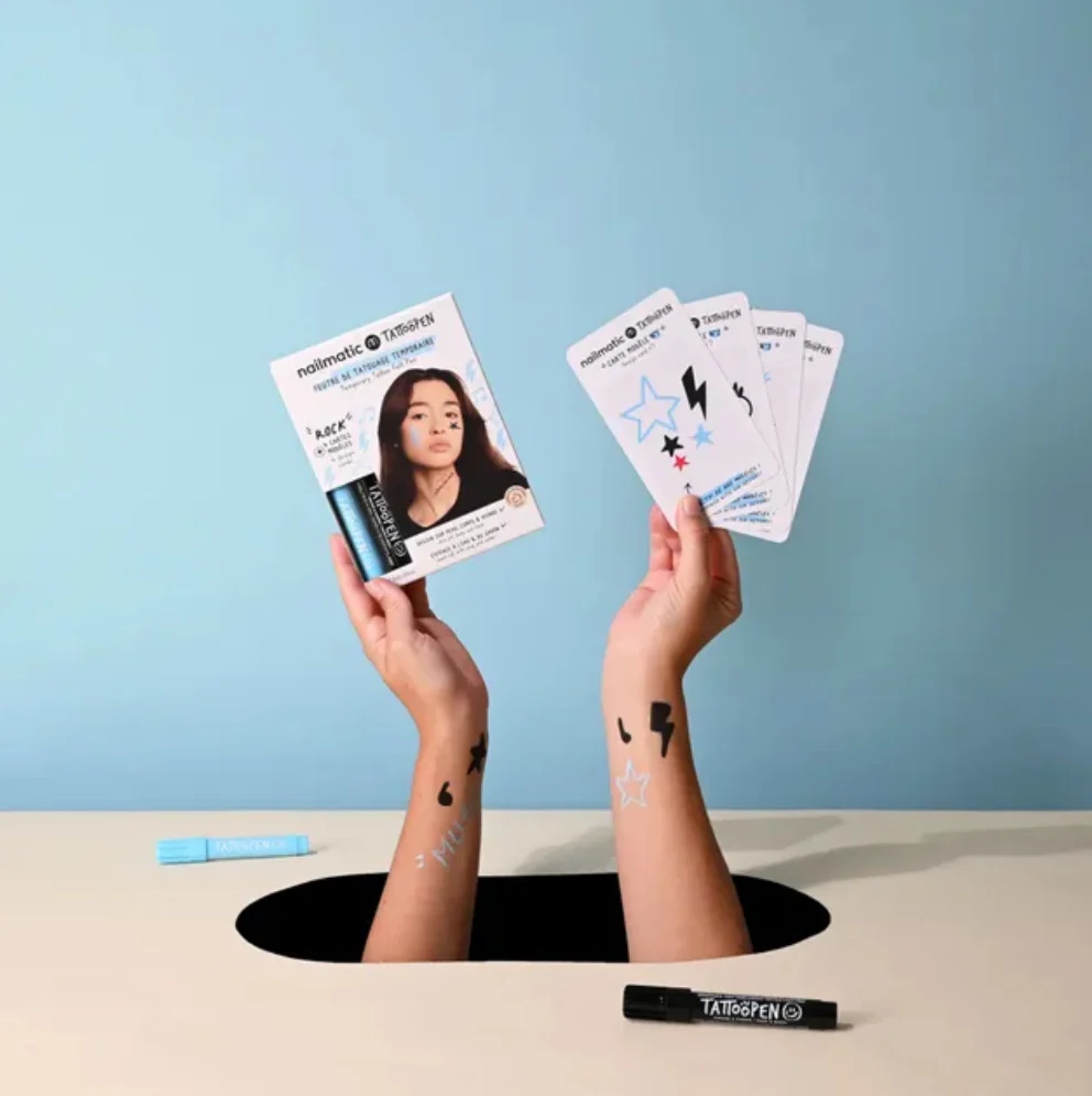 Chaque détail a été pensé pour que les enfants puissent s’amuser en toute sécurité : cartes aux coins arrondis faciles à manipuler, encre composée à 60 % d’eau et testée dermatologiquement et ophtalmologiquement. Ces tatouages temporaires se lavent simplement à l’eau et au savon. Les enfants peuvent dessiner partout, du visage aux mains, pieds, bras, épaules, front et joues, pour un look 100 % cool !