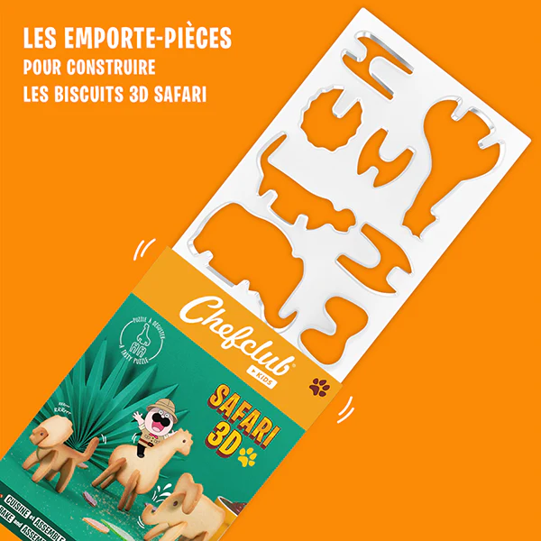On part à l’aventure avec le kit d’emporte-pièces pour cuisiner et assembler les biscuits 3D safari girafe, lion et éléphant !