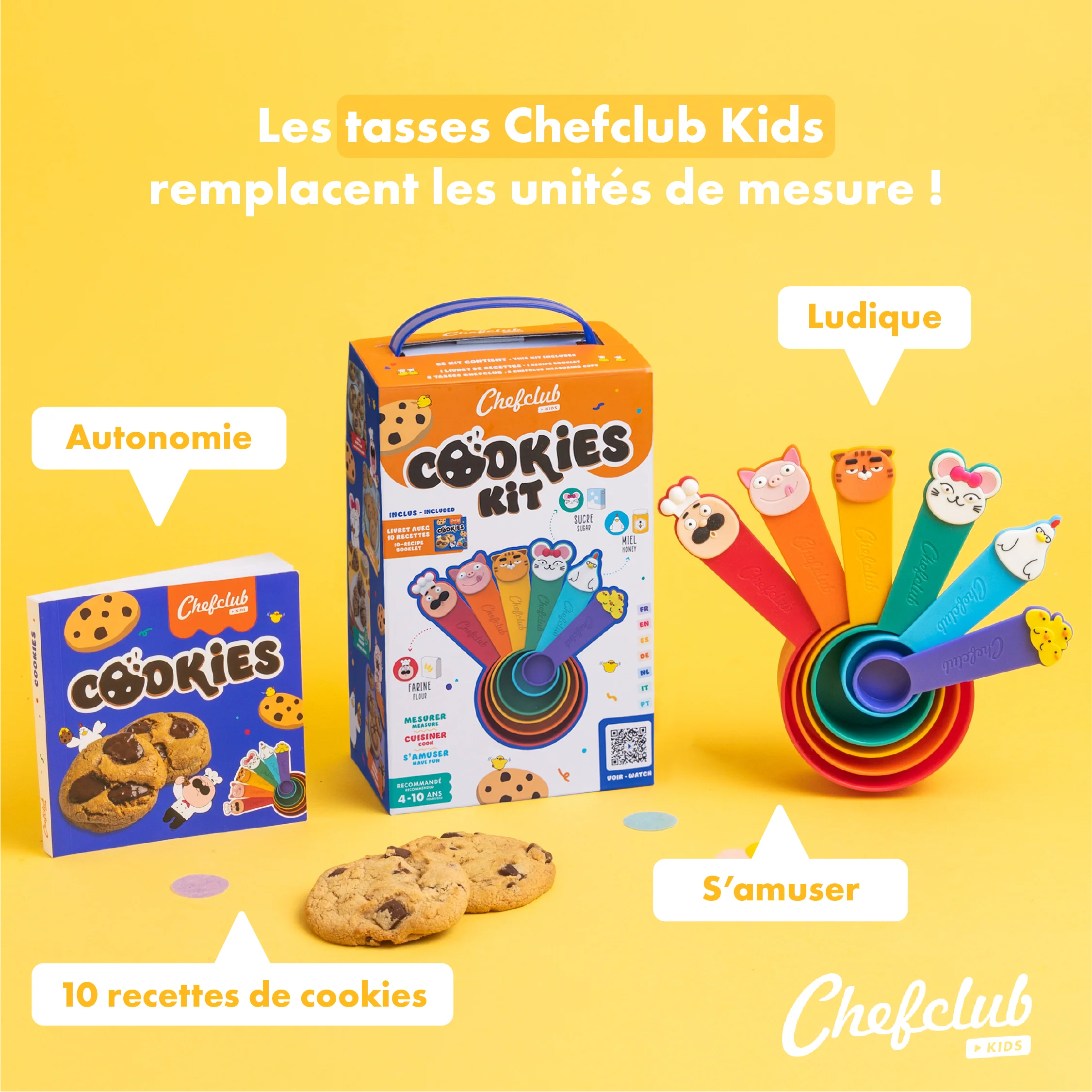 Grâce aux tasses, fini le casse-tête de la pesée ! Les grammes et les centilitres se transforment en personnages Chefclub Friends pour une expérience simple, ludique et éducative.