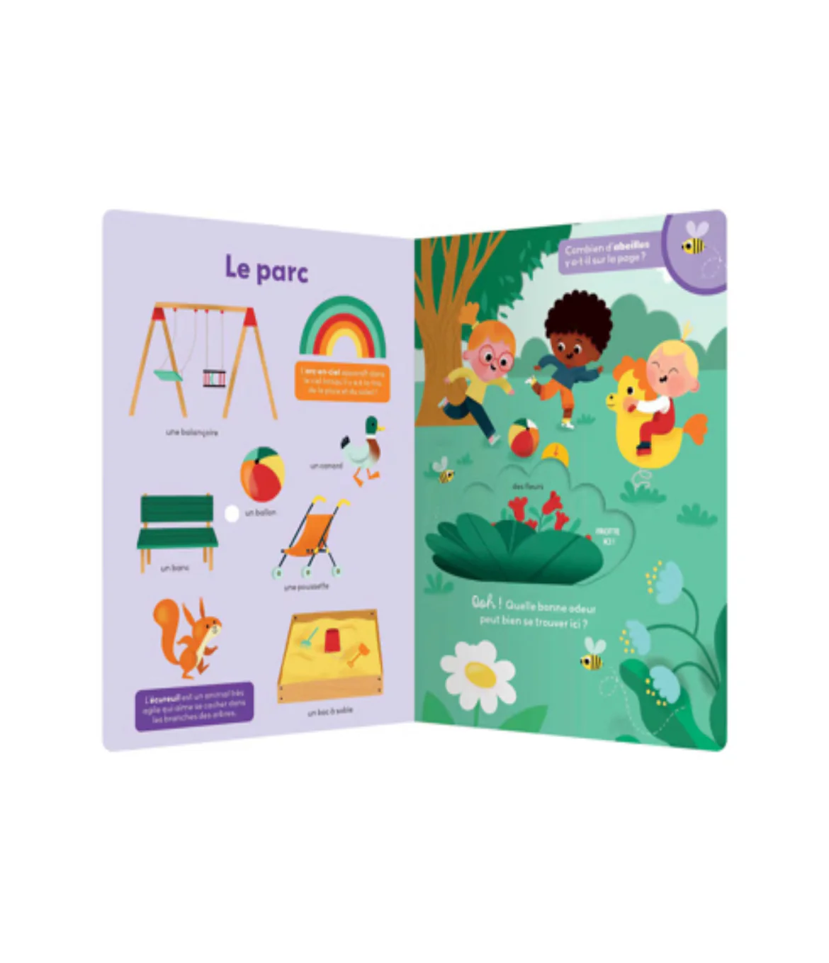 Sur chaque double-page, l’enfant pourra découvrir des informations étonnantes, jouer à compter des éléments (jusque 10) et entraîner sa motricité fine grâce à un grand flap qui cache une odeur amusante !
