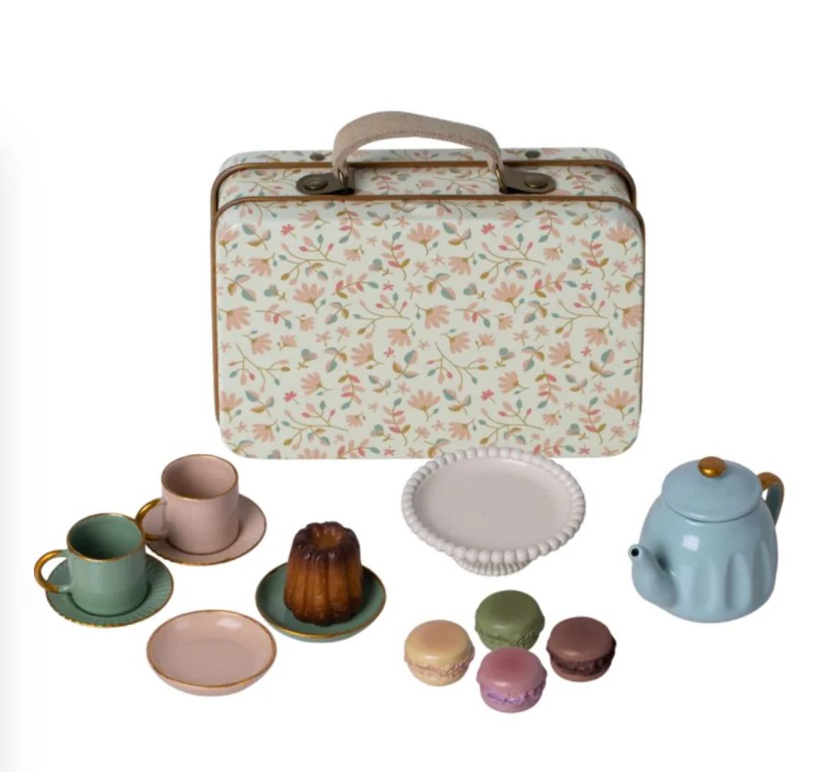 Le moment du thé est arrivé pour les petites souris qui vont savourer de délicieuses douceurs. Ce service à thé est soigneusement présenté dans une valise en métal joliment décorée.