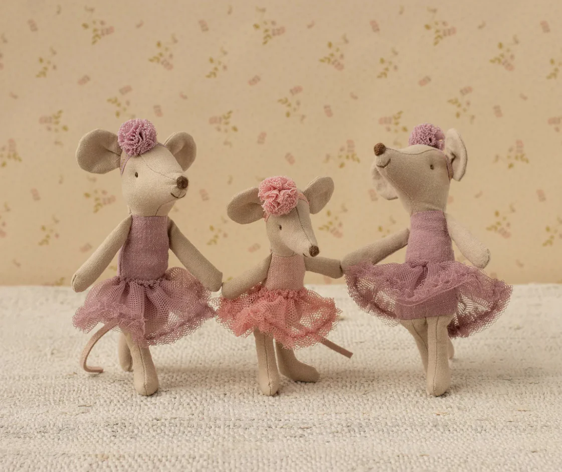 La grande sœur souris est vêtue d’une élégante tenue de ballerine. Avec son tutu rose et son délicat bandeau, elle est parfaitement équipée pour passer des heures joyeuses à danser et s’amuser.