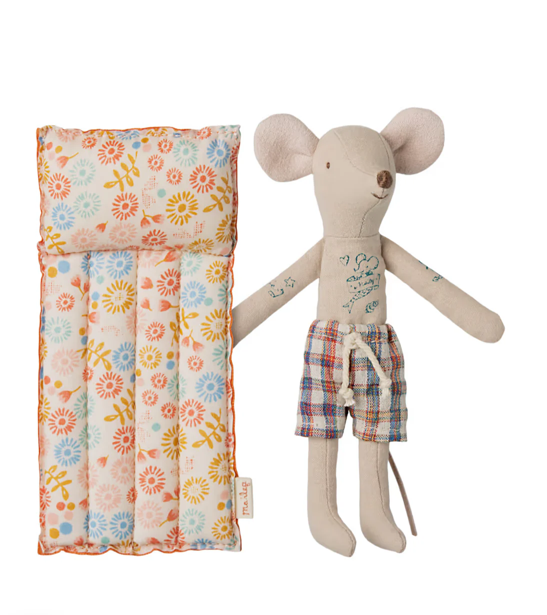 Ce set est idéal pour l’été, avec un papa souris décontracté accompagné de son matelas de plage aux motifs floraux. Il porte un short à carreaux et est prêt à profiter d’un moment de détente sous un soleil radieux. Dès 3 ansDimensions de la souris : 15 cmMatières : coton