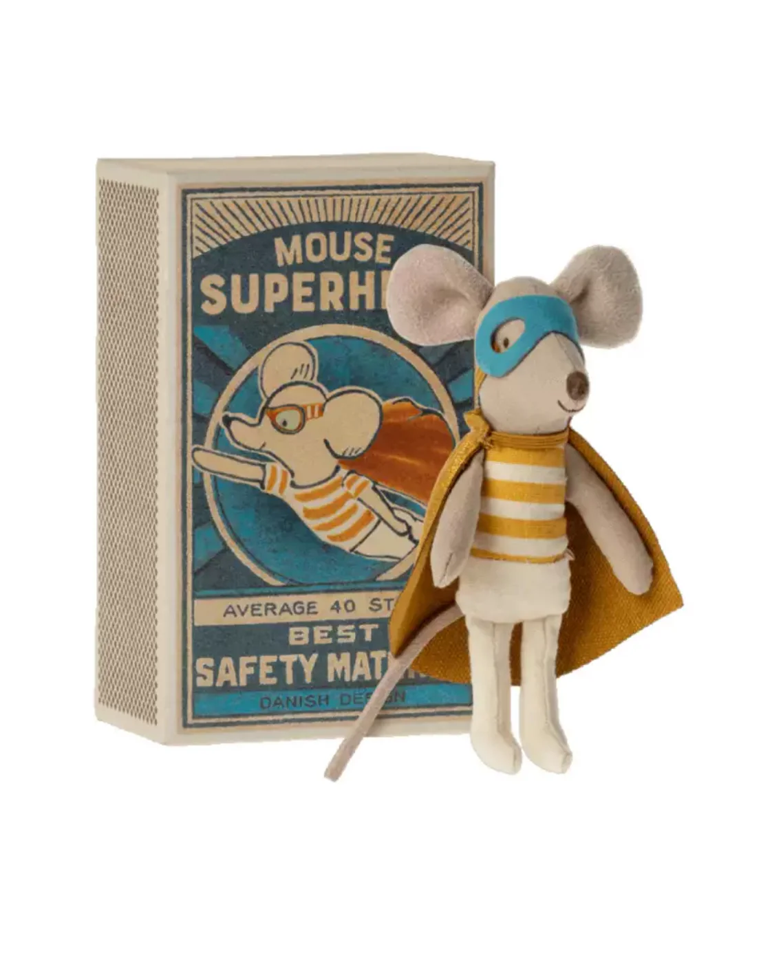 Un incontournable de Maileg revisité avec un soupçon de super-pouvoirs ! Cette charmante souris est prête à vivre de longues aventures et se transforme en super-héros grâce à son masque spécial. Après ses exploits, elle se détend confortablement dans sa boîte d’allumettes. Ses vêtements et son linge de lit, proposés dans des imprimés originaux et des couleurs élégantes, apportent une touche de charme supplémentaire. Livrée avec deux masques, un pour les moments de repos et un autre pour ses missions héroïques. L’ensemble est présenté dans une jolie boîte en carton, parfaite pour offrir des instants de douceur.