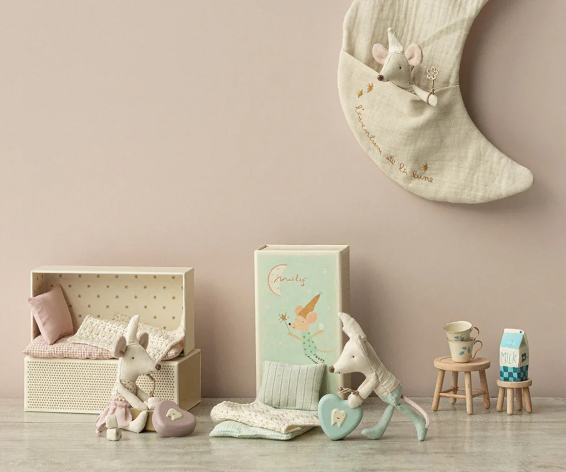 C’est l’heure des vacances ! Cette peluche souris Maileg est prête pour une journée à la plage, vêtue d’un maillot de bain et accompagnée de sa planche de surf en bois, parfaite pour ses aventures en mer. Son matelas en bois complète le set. Les vêtements amovibles permettent de changer facilement la tenue de la souris. Maileg crée chaque année des accessoires et figurines de grande qualité, conçus pour durer et se transmettre de génération en génération.