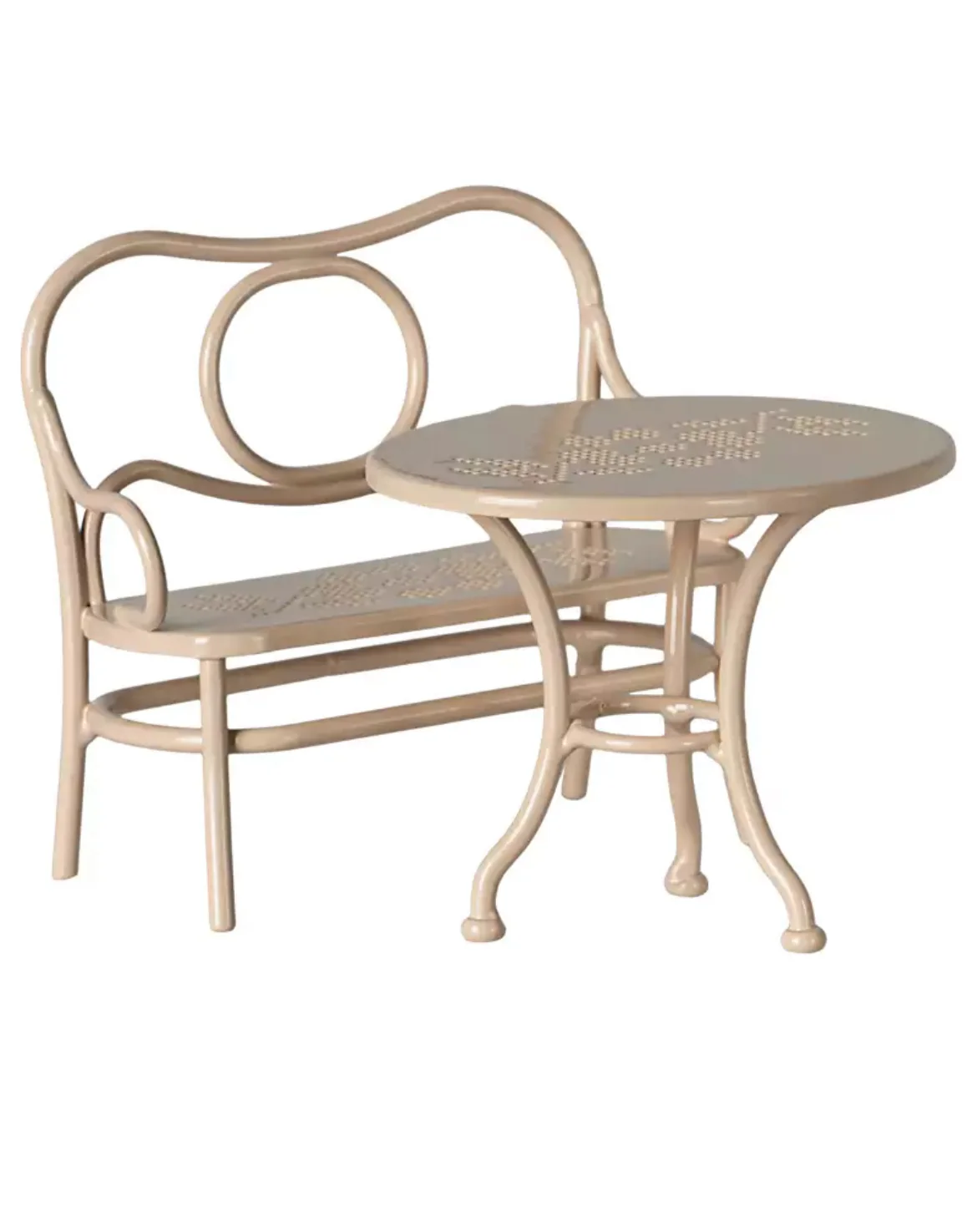 Créez une ambiance de café parisien dans la maison de vos figurines Maileg grâce à ce set comprenant une petite table, un banc et une chaise en rose pâle. Conçu spécialement pour les souris et petits lapins Maileg, cet ensemble au style vintage est réalisé en métal finement travaillé, orné de perforations délicates qui lui confèrent un charme authentique et romantique.