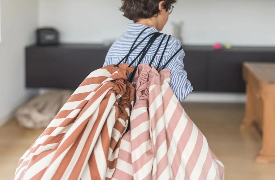Avec les sacs de rangement et tapis de jeu Play&Go, jouer et ranger deviennent un vrai jeu d’enfant ! Les petits adorent emmener leurs jouets partout, mais les boîtes classiques sont souvent lourdes et peu pratiques à transporter. Voilà pourquoi le sac Play&Go est si pratique : léger et facile à glisser dans un sac à dos ou une valise, il se porte aussi à la main. Que ce soit pour les lego, les peluches ou les jouets de plage, les enfants peuvent les emporter chez des amis, chez papi et mamie, en vacances ou simplement d’une pièce à l’autre. Une fois ouvert, il se déploie en tapis de jeu de 140 cm de diamètre. Disponible en plusieurs motifs, couleurs et tailles, il s’adapte à toutes les envies !