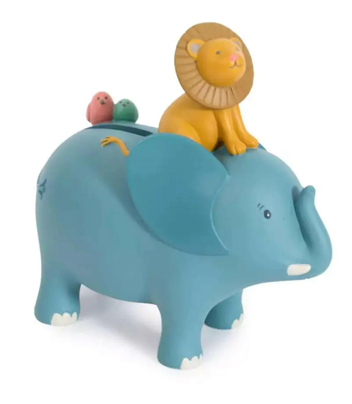 Cette tirelire en résine présente Paprika le lion accompagné de ses amis oiseaux, tous voyageant sur le dos d’un éléphant. Elle sera un ajout charmant et réconfortant pour embellir la chambre.