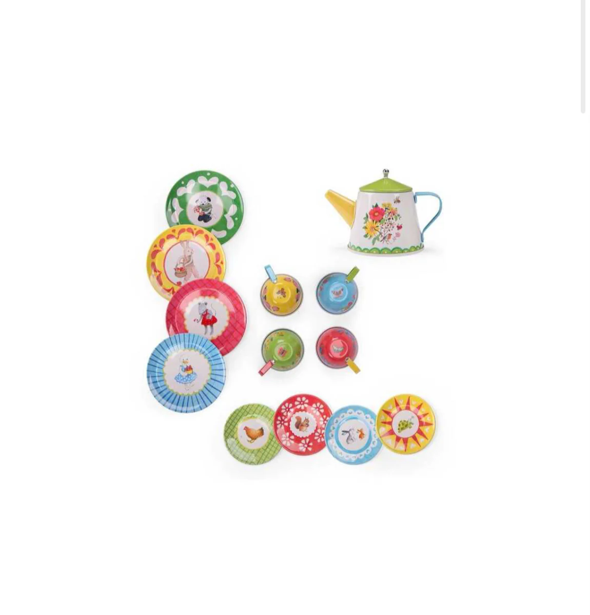 Plongez dans l’univers charmant de la valisette dînette thé de la collection La Grande Famille signée Moulin Roty. Ce coffret en métal de 14 pièces séduit par ses teintes douces, ses motifs floraux et les illustrations délicates. Il comprend un plateau, une théière, quatre assiettes à dessert, ainsi que quatre tasses et soucoupes assorties, parfaits pour des moments de jeu pleins de poésie.