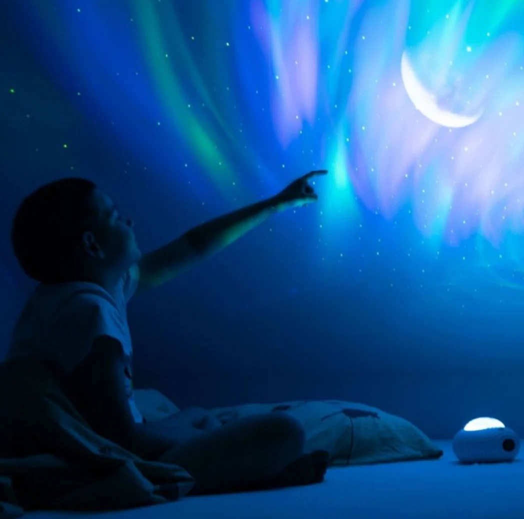 Le projecteur OVNI est une véritable merveille, difficile à décrire tant ses effets sont captivants. Il projette un ciel étoilé, une lune brillante ou une aurore boréale colorée qui s’anime au rythme d’une mélodie douce et relaxante. Idéal pour s’évader dans des rêves profonds et enchanteurs ! Sans fil et très facile à manipuler, il est livré avec une télécommande pour le contrôler où que vous soyez dans la pièce. Il diffuse aussi des bruits blancs apaisants pour un moment de calme parfait.